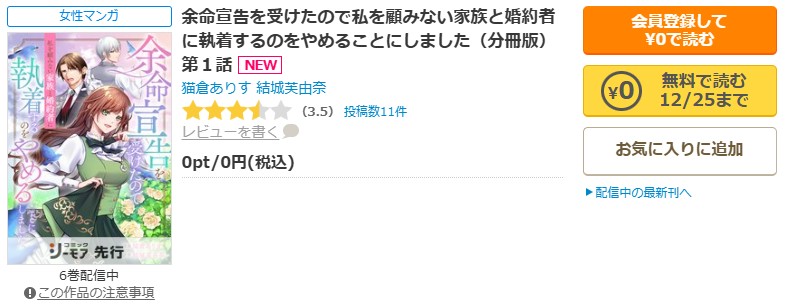 余命宣告を受けたので私を顧みない家族と婚約者に執着するのをやめることにしましたの全巻無料情報と漫画raw・pdfでの取り扱い